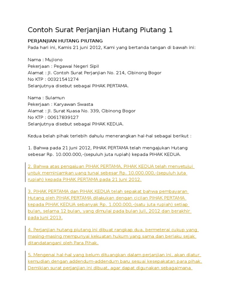Contoh surat pernyataan hutang piutang kepada orang lain. Tutup surat perjanjian anda dengan pernyataan bahwa surat perjanjian tersebut telah disetujui oleh kedua pihak tanpa paksaan dari pihak manapun. Contoh surat jual beli tanah. Surat pernyataan hutang yang digunakan untuk menyatakan bahwa seseorang telah berhutang dan akan melunasi hutangnya sesuai dengan tanggal jatuh tempo. Hal ini karena mengingat bahwa orang yang awam sekalipun mayoritas pernah membuatnya untuk keperluan tertentu.